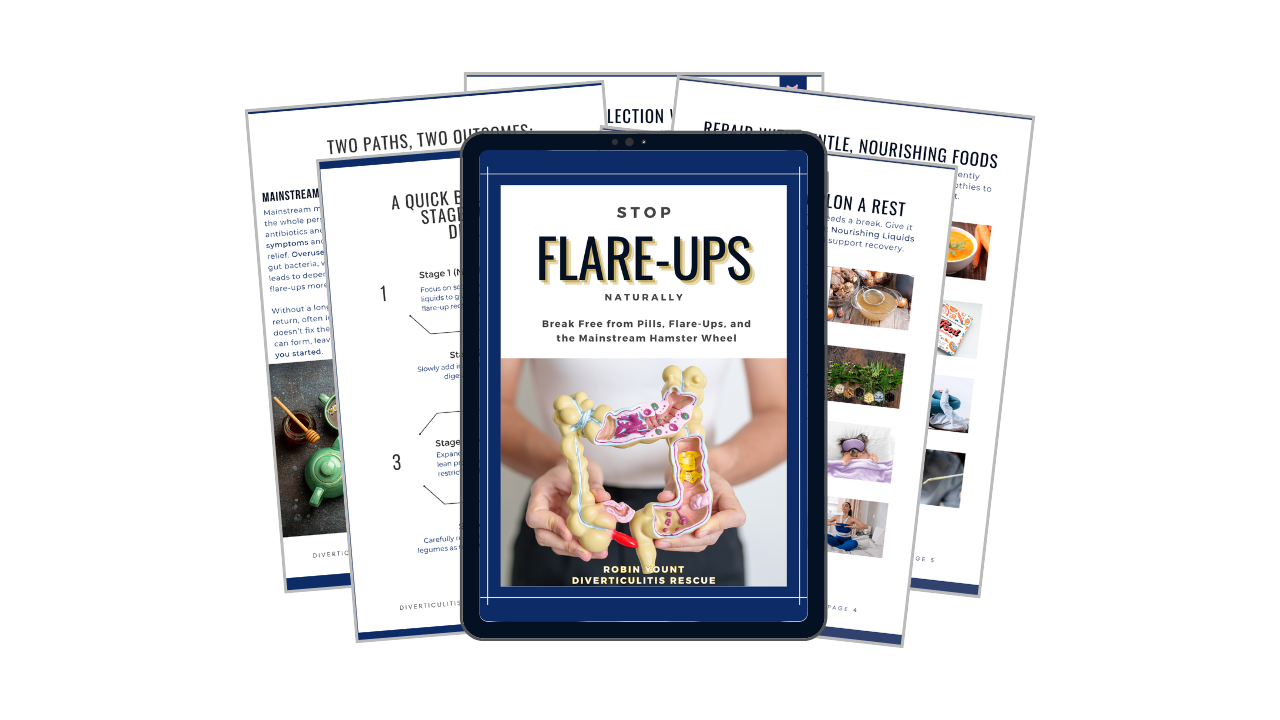 Mainstream diets and low-fiber lists won’t get you out of the flare cycle. This 50-page ebook gives you 27 diverticulitis-safe recipes that actually work—plus bonus Supplement Cheat Sheet, 4 Stages Survival Guide & SAD to Supported Guide to help you step into a natural, long-term approach.